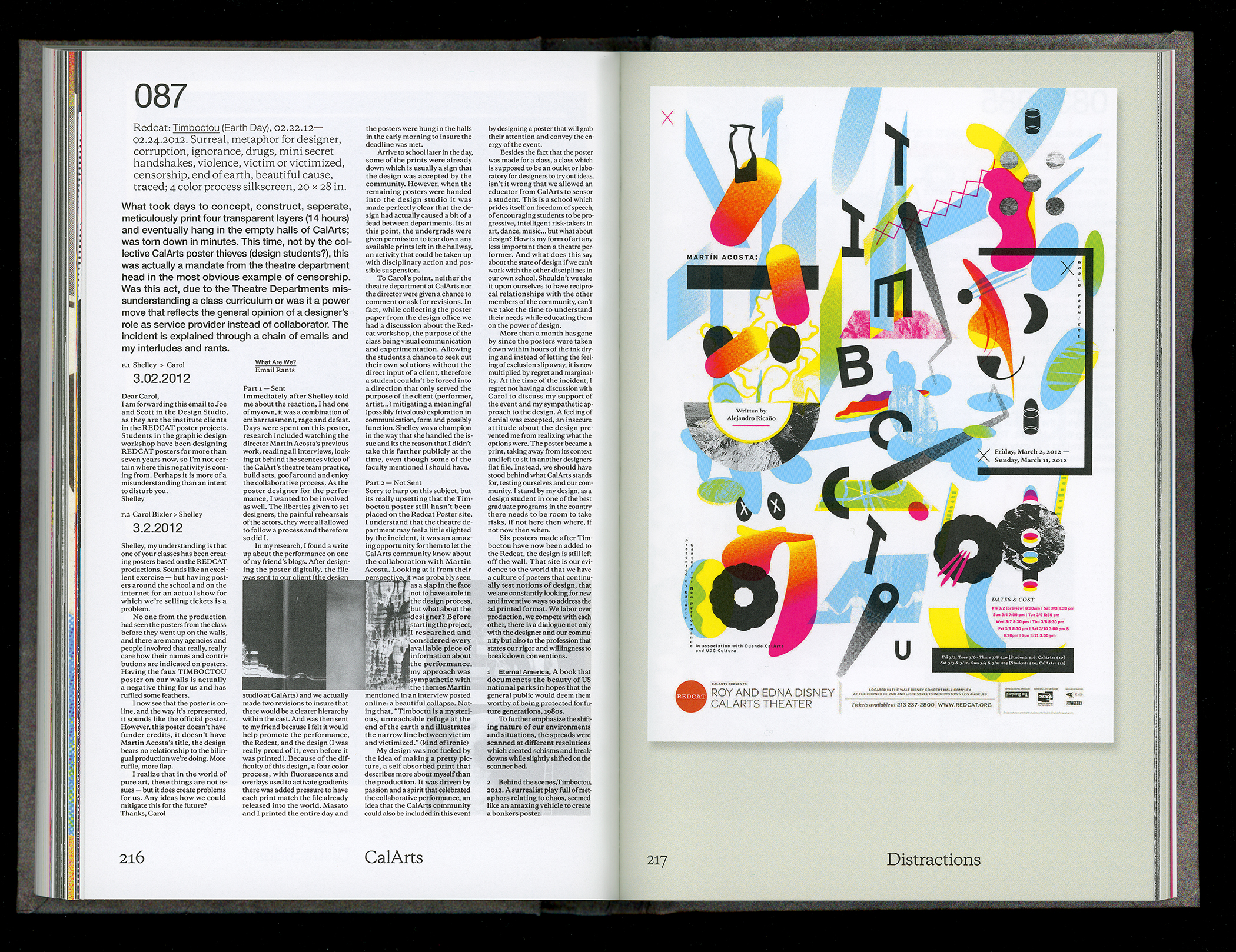Captions: (1) P1W2 is an archive of a frenatic time. A book made five years after graduating from CalArts. A look back into the notes, research, scribbles, that lead to posters and discoveries made late at night; (2) CalArts Posters [varying sizes, all hand silk-screened] With each new poster there developed a thread of celebration, an event that allowed the designer to step outside of the everyday and try out a new mask. With each mask, new tones and personalities developed, some to scream and some to whisper.